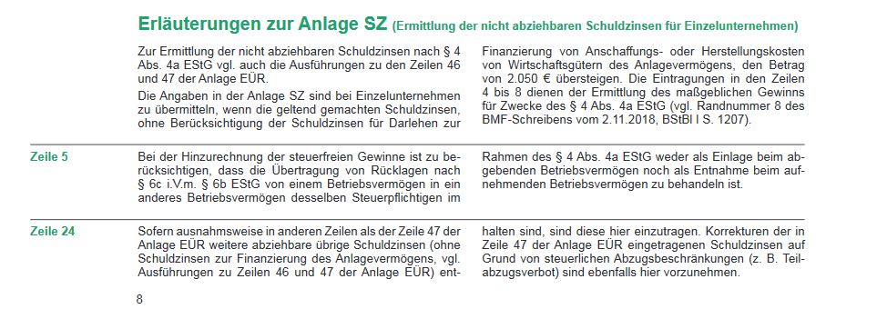 Anlage SZ (Ermittlung der nicht abziehbaren Schuldzinsen) zur Anlage EÜR für das Jahr 2018