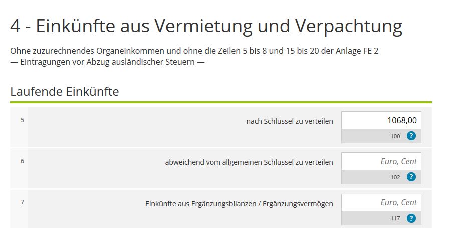 Wie von @Korsika richtig angemerkt und auch am Beispiel gezeigt, lassen sich in der Anlage FE 1 unter 4. Einkünfte aus Vermietung und Verpachtung die nach Schlüssel zu verteilenden Einkünfte in Zeile 5