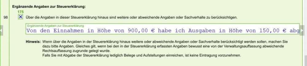 Meine Frage ist nun wo und wie ich diese Einnahme in meiner Lohnsteuererklärung angeben kann. Ich habe verschiedene Aussagen gelesen. Zum einen in der Anlage S oder SO. (und gebe ich die gesamten 900 EUR an abzgl. Aufwendungen in Höhe von 214,20 EUR an) Ich bin gerade ein wenig ratlos und bedanke mich bereits jetzt für Antworten.