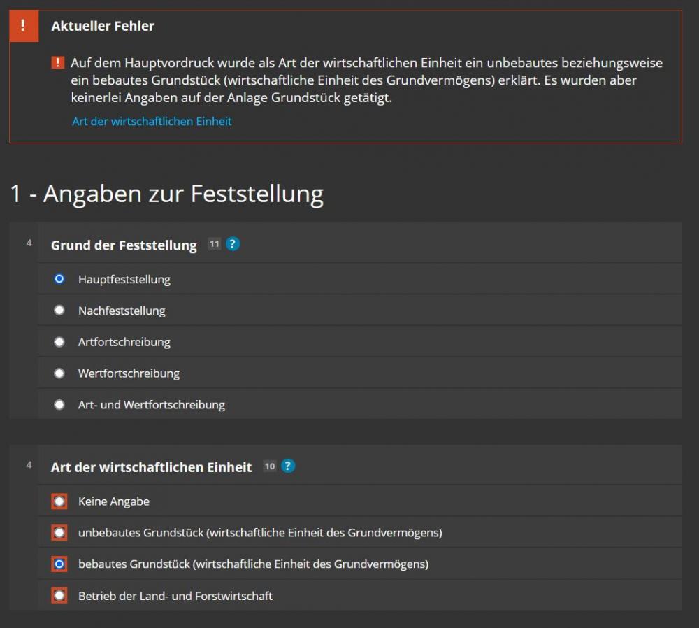 beim Grundsteuer-Formular wird nach dem Prüfen des Formulars die Fehlermeldung ausgegeben, dass bei "Art der wirtschaftlichen Einheit" nichts dazu angegeben wurde. Ausgewählt wurde "bebautes Grundstück (wirtschaftliche Einheit des Grundvermögens)". Gemarkung und Flurstück zu Grundvermögen wurde ausgefüllt.
